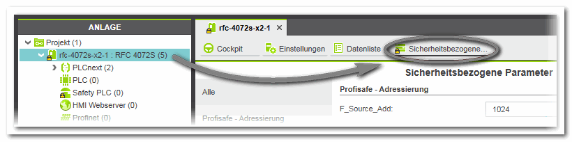Der Editor 'Sicherheitsbezogene Parameter' ist nur verfügbar, wenn im Projekt eine sicherheitsbezogene SPS enthalten ist. Der Editor gehört zum Steuerungsknoten: