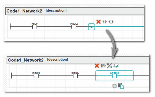 In NKOP und SNKOP (wie auch in AS) können Sie ganze Netzwerke einfügen (erzeugt einen neuen Codeabschnitt) oder auch einzelne Elemente. Um ein Element direkt in ein vorhandenes Netzwerk einzufügen, muss vorher eine geeignete Verbindungslinie (d.h. eine gültige Codeposition) ausgewählt werden.
