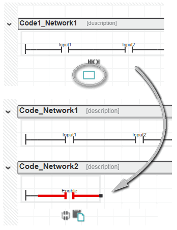 In NKOP- und SNKOP-Code wird das Netzwerklayout durch den Editor vorgeschrieben. Objekte können daher nicht verschoben werden. Nur ganze Codeabschnitte können vertikal verschoben werden, wodurch die Reihenfolge aller Abschnitte im Arbeitsblatt geändert wird: