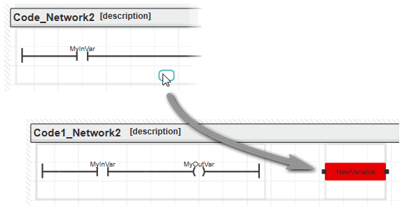 - Um eine nicht verbundene Variable einzufügen, setzen Sie den Cursor in eine leere Zelle im Code-Arbeitsblatt.In NKOP/SNKOP müssen Sie den Cursor innerhalb des Netzwerkrahmens setzen (wie unten gezeigt). Dann wird die neue, unverbundene Variable rechts von der Stromschiene eingefügt: