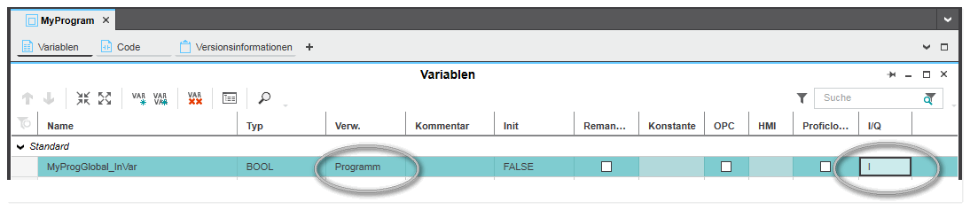 - Geben Sie in der Spalte 'I/Q' an, ob die Variable mit einem Eingangssignal (I) oder Ausgangssignal (Q) verbunden werden soll.Durch Angabe der Datenrichtung in der Spalte 'I/Q' in der Variablentabelle des Programms wird die programmglobale Variable automatisch in die Datenliste der Ressource übernommen.