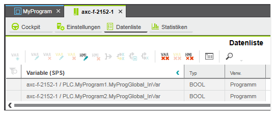 - Doppelklicken Sie in der ANLAGE auf den 'IEC 61131-3'-Knoten und öffnen Sie im Editorenbereich die Datenliste.In der Datenliste wurde die Variable automatisch für jede Instanz des Programms eingefügt, in dem die Variable deklariert ist. Die 'Verwendung' wird automatisch auf 'Programm' gesetzt.