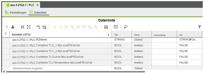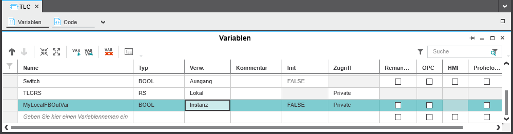 Um eine 'Instanz'-Variable für einen FB zu deklarieren, gehen Sie wie folgt vor:- Öffnen Sie die Variablentabelle der FB-POE, die mehrfach instanziiert werden soll.