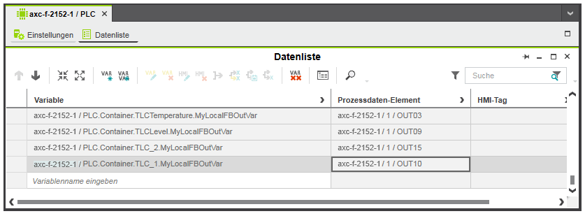 Die Zuordnung einer Variablen zu einem Prozessdaten-Element kann nur in der Datenliste der Ressource ('IEC 61131-3'-Knoten) oder der Steuerung erfolgen (siehe hierzu das Thema "Rollenzuordnung in Datenlisten: I/O-Variablen und Austauschvariablen"). Ressourceglobale Variablen werden in der Datenliste mit dem Schlüsselwort 'Global' deklariert. Eine ressourceglobale Variable, die einem Prozessdaten-Element zugeordnet ist, wird als ressourceglobale I/O-Variable bezeichnet. Diese Variable kann in allen POEs der Projekts verwendet werden.