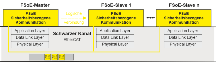 Das zugrunde liegende Standard-EtherCAT-Kommunikationsmedium bleibt unverändert und überträgt sowohl sicherheitsbezogene als auch Standard-Daten. Das Transportmedium wird als Schwarzer Kanal (Black Channel) betrachtet, auf dem das FSoE-Protokoll eine sicherheitsbezogene logische Datenverbindung aufsetzt. Auf diese Weise kann eine dezentrale Sicherheitslogik etabliert werden.