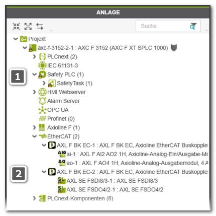 Voraussetzungen: Die EtherCAT-Funktionalität und damit auch die EtherCAT-bezogenen Knoten in der ANLAGE und Editoren stehen nur zur Verfügung, wenn die Steuerung dies unterstützt (PLCnext Technology-Steuerungen ab Firmware-Version 2026.0) und die Funktionalität in PLCnext Engineer aktiviert wurde. Dazu gehen Sie wie folgt vor: