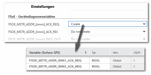 Gehen Sie folgendermaßen vor:- Doppelklicken Sie in der ANLAGE auf den 'Safety PLC'-Knoten und öffnen Sie den 'Einstellungen'-Editor.Es gibt zwei Kategorien an Variablen, die erzeugt werden können: