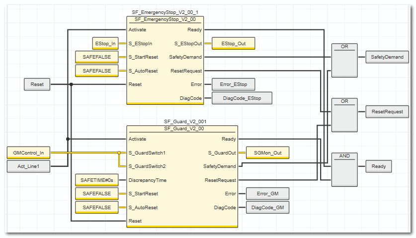 In this example, different items of safety equipment, which are evaluated by different safety-related function blocks, act on different safety-related outputs of the Sicherheitssteuerung: For the function block SF_EmergencyStop on output S_EStop_Out (global I/O variable EStop_Out) and for SF_GuardMonitoring on output S_GuardMonitoring (global I/O variable SGMon_Out). These outputs control different, mutually independent safety-related functions.