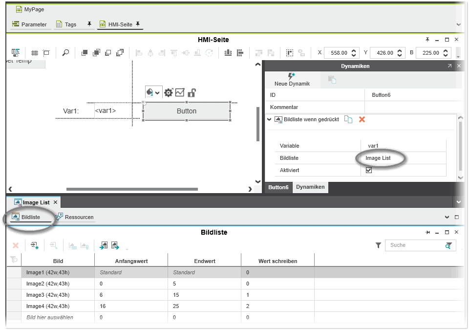 Mit Hilfe der Dynamik 'Bildliste' können Sie Bildlisteneinträge dynamisch machen. Dynamisch bedeutet, das zur Laufzeit angezeigte Bild für ein HMI-Objekt kann abhängig vom Wert des HMI-Tags bzw. der Variablen (Ganzzahl oder Gleitkommazahl), das bzw. die mit der Bildlistendynamik verknüpft ist, verändert werden. So können Sie z.B. eine Bildlistendynamik einer HMI-Schaltfläche zuweisen, um ein Bild in der Schaltfläche anstelle des numerischen Variablenwerts in der HMI-Applikation anzuzeigen, wenn der Variablenwert einen bestimmten Wert hat oder innerhalb eines bestimmten Bereichs liegt.