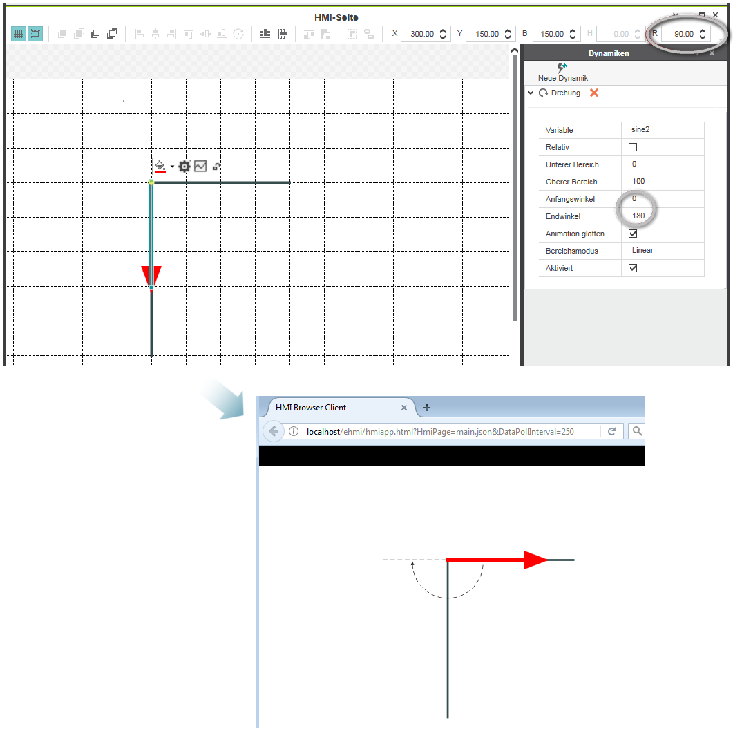 - Absolute Drehung (Kontrollkästchen 'Relativ' ist deaktiviert)Der Startwert für die Drehung des Objekts ist wie folgt:Start Drehung = 0 + AnfangswinkelDer für das Objekt auf der HMI-Seite eingestellte Startdrehwert wird ignoriert und der Wert der Variable wird angewendet auf einen Startwert für die Drehung von 0 Grad plus 'Anfangswinkel', wenn dieser definiert ist.