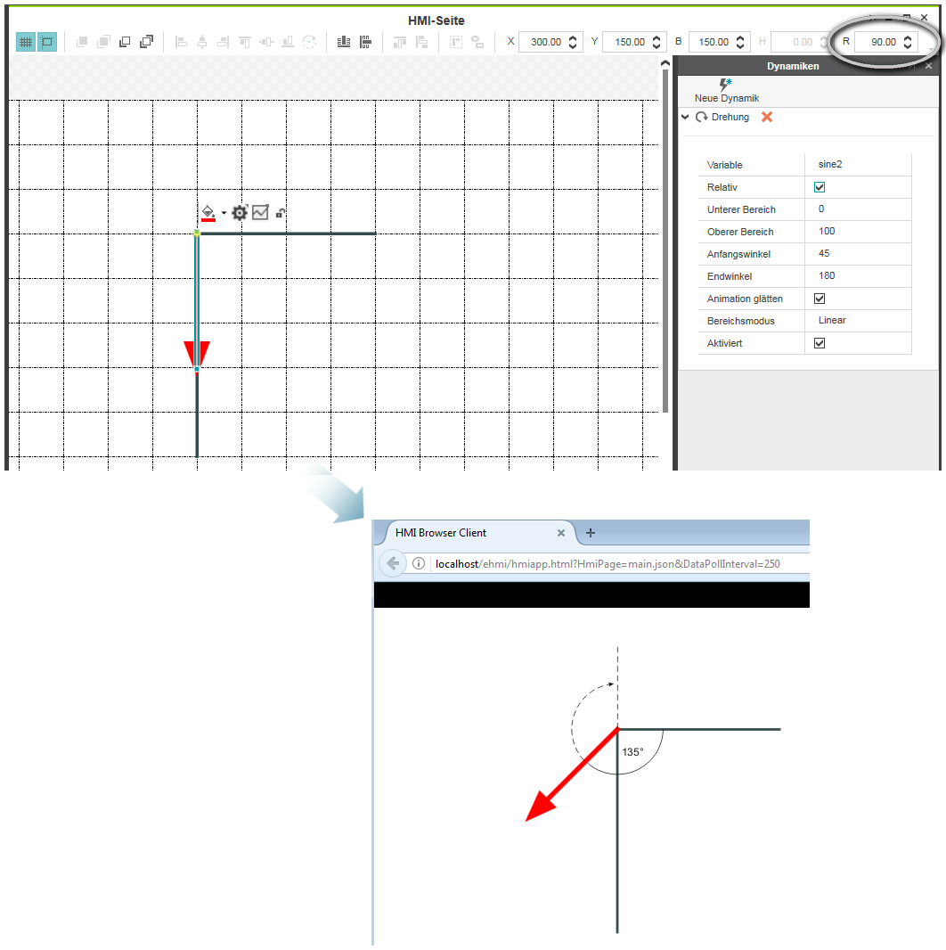 Die Dynamik 'Drehung' dreht das Objekt um den festgelegten Drehpunkt (Transformationsnullpunkt) in Abhängigkeit vom Wert der dem HMI-Tag zugeordneten numerischen Variablen oder dem Auswertungsergebnis des Ausdrucks.