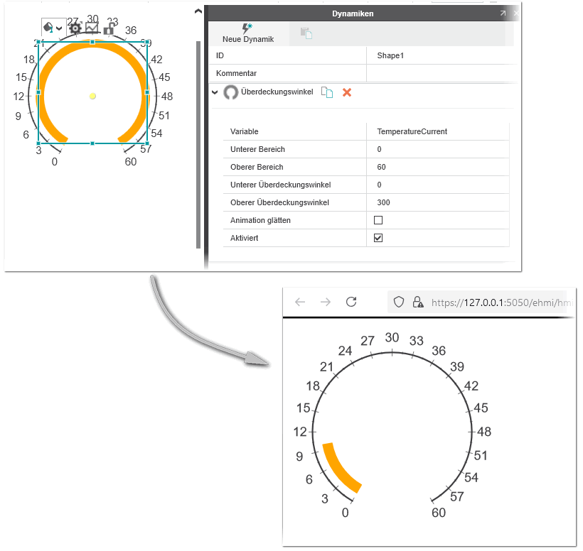 Die Dynamik 'Überdeckungswinkel' ändert die Eigenschaft des Überdeckungswinkels eines Kreisbogens in Abhängigkeit vom Wert der numerischen Variablen, die dem HMI-Tag zugeordnet ist, oder dem Auswertungsergebnis des Ausdrucks. Die Dynamik interpoliert den definierten Überdeckungswinkel auf dem Kreisbogen auf der Grundlage des Bereichs zwischen dem definierten 'Unteren Bereich' und dem 'Oberen Bereich' (d. h. dem Wertebereich für die Steuervariable, die mit dem HMI-Tag verknüpft ist).