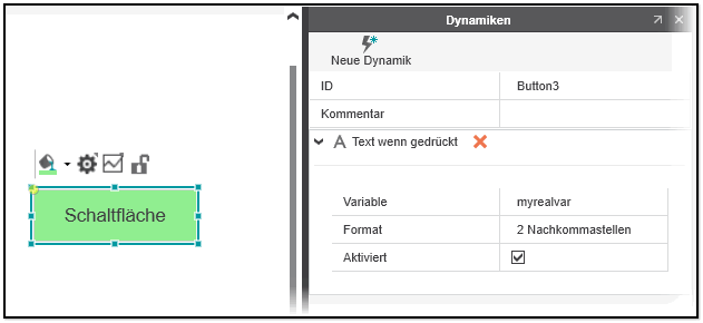 Mit den folgenden Einstellungen wird zur Laufzeit der Wert der REAL-Variable 'myrealvar' mit einer Genauigkeit von 2 Ziffern nach dem Dezimaltrennzeichen angezeigt, wenn die Schaltfläche gedrückt wird.