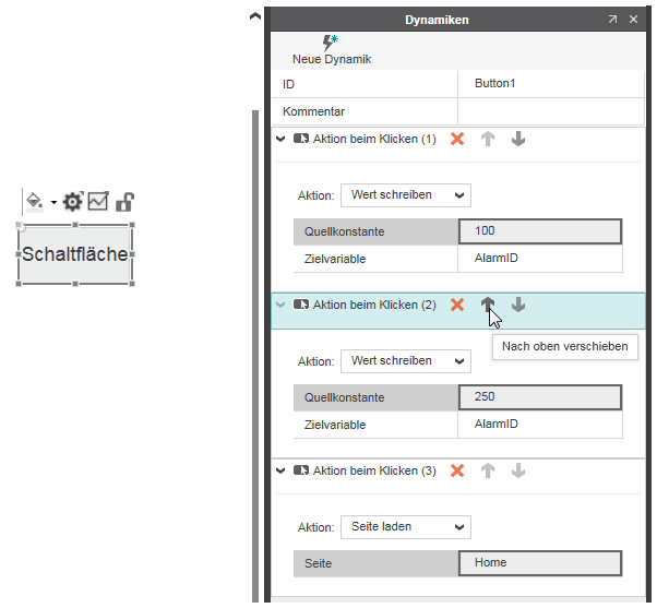 Die drei 'Aktion beim Klicken'-Dynamiken werden in der gezeigten Reihenfolge ausgeführt, wenn der Anwender die Schaltfläche auf der HMI-Seite drückt. Zuerst wird der Wert 100 in die Variable 'AlarmId' geschrieben. Mit dem zweiten Befehl wird der Wert 250 in die Variable 'AlarmId' geschrieben und mit dem letzten Befehl kehrt der Anwender wieder zurück zur Startseite.