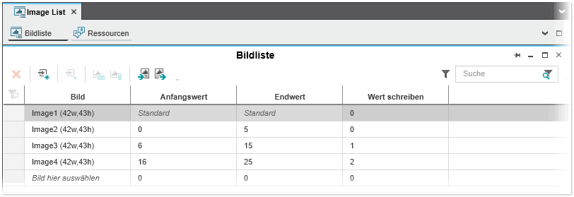 in der Symbolleiste.Beim Einfügen neuer Einträge gilt Folgendes:(Um einen Bildlisteneintrag zu löschen, markieren Sie die Tabellenzeile und drücken <Entf> oder klicken auf die Schaltfläche 'Löschen' in der Symbolleiste.)- Die Start-, End- und Schreibwerte werden automatisch ausgewählt, wobei die vorhandenen Werte berücksichtigt werden.