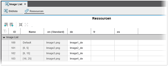 Der 'Ressourcen'-Editor enthält eine einzelne Zeile für jeden Bildlisteneintrag, der im 'Bildliste'-Editor definiert ist. Jeder Eintrag besteht aus einer ID, dem Namen, dem Quellbild in der Standardsprache und den zugehörigen sprachspezifischen Versionen. (Die ID und der Name sind schreibgeschützt und werden automatisch generiert. Der Name wird aus dem für den Bildlisteneintrag definierten Wertebereich gebildet.)