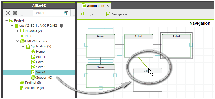 2. Ziehen Sie die HMI-Seite aus der ANLAGE in den Editor und legen Sie die Seite auf dem gewünschten Verbindungspunkt ab.