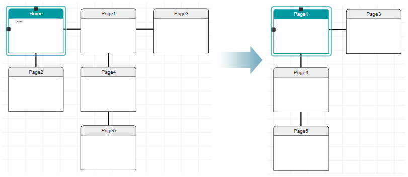 Wenn die Startseite rechts mit einer Seite verbunden ist, wird diese Seite zur neuen Startseite ('Page1' im folgenden Beispiel). Die neue Startseite wird in der ANLAGE mit dem Startseitensymbol gekennzeichnet. Alle untergeordneten Seiten der gelöschten Startseite werden ebenfalls gelöscht ('Page2' im folgenden Beispiel).