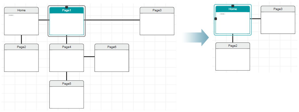 • Das Löschen einer Seite, mit der mehrere Seiten verbunden sind, löscht die Seite und alle untergeordneten Seiten im 'Navigation'-Editor. Im folgenden Beispiel werden durch das Löschen von 'Page1' die untergeordneten Seiten 'Page4', 'Page5' und 'Page6' gelöscht.
