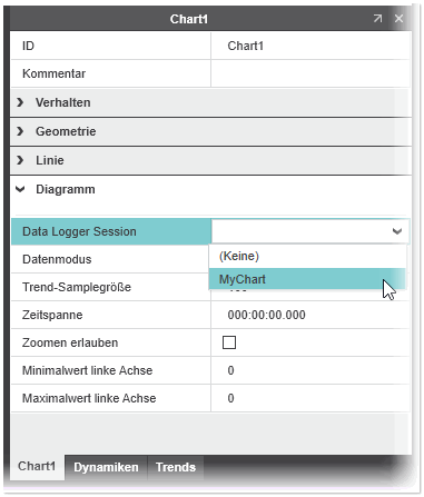 - Wählen Sie in der Gruppe 'Diagramm' die Data Logger-Session, die als Quelle für die Trenddaten verwendet werden soll, aus dem Listenfeld 'Data Logger-Session' aus. (Das Listenfeld enthält alle TSDB-Sessions, die im Editor 'Data Logger-Sessions' konfiguriert sind).