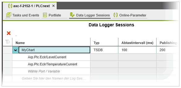 Details zur Konfiguration einer Data Logger Session finden Sie im Abschnitt "So konfigurieren Sie den Data Logger in PLCnext Engineer" im Thema "Data Logger".