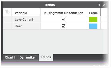 'Trend-Samplegröße' Gibt an, wie viele Datenpunkte pro Trendlinie im Diagramm angezeigt werden sollen.Im 'Downsample'-Modus beträgt die maximal erlaubte Samplegröße 100. Im 'Raw'-Modus ist der Maximalwert 1000. 'Zeitspanne' Stellen Sie hier ein, aus welchem Zeitraum die in der Data Logger Session verfügbaren Datenpunkte angezeigt werden sollen (von aktueller Zeit bis zur eingegebenen Zeitspanne). Mit dem Wert 0 werden alle verfügbaren Datenpunkte angezeigt.Im 'Raw'-Modus wird der maximale Zeitraum durch die Zeit zwischen den Datenpunkten (minimales Zeitstempelintervall) in Kombination mit der Anzahl der Punkte, die pro Trendlinie angezeigt werden können (Samplegröße), bestimmt und umgekehrt. 'Zoomen erlauben' Wenn aktiviert, werden unter dem Diagramm einstellbare Schieberegler angezeigt, mit denen Sie den Zeitbereich vergrößern/verkleinern können. 'Maximalwert linke Achse' / 'Minimalwert linke Achse' Definieren Sie hier den Wertebereich für die Y-Achse (kleinster und größter Wert, der angezeigt werden kann). Wenn beide Werte 0 sind, wird die Y-Achse automatisch skaliert. - Wählen Sie hier die Variable aus der Data Logger-Session aus, die aufgezeichnet werden soll und deren Linienfarbe. Öffnen Sie dazu das Register 'Trends' und aktivieren Sie dort für jede Variable, die im Diagramm angezeigt werden soll, das zugehörige Kontrollkästchen (die Liste enthält alle Variablen, die in der verknüpften Data Logger Session aufgezeichnet werden). Um die Linienfarbe einer Variablen zu ändern, klicken Sie auf das Farbfeld und wählen die gewünschte Farbe aus.