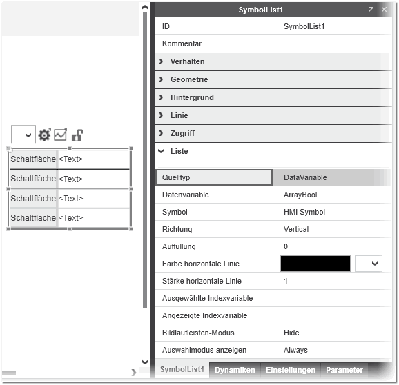 Die Parameter für die Verknüpfung des Arrays mit der Symbolliste (siehe die folgende Tabelle) befinden sich in der Kategorie 'Liste' im Eigenschaftenregister des Objekts.