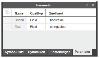 Wie bei Standard-Symbolinstanzen werden die Symbolparameter in der 'Parameter'-Registerkarte der Symbolliste eingestellt. Der 'Quelltyp' ist per Voreinstellung auf 'Feld' gesetzt. Die Auswahlliste unter 'Quellwert' basiert auf der 'Datenvariable', die im Eigenschaftenregister des Symbols eingestellt ist. Bei einem Array einer Struktur enthält die Auswahlliste die unterstützten Elemente. Bei einem Array eines elementaren Datentyps oder Enumeration-Datentyps kann nur der Eintrag "." ausgewählt werden.