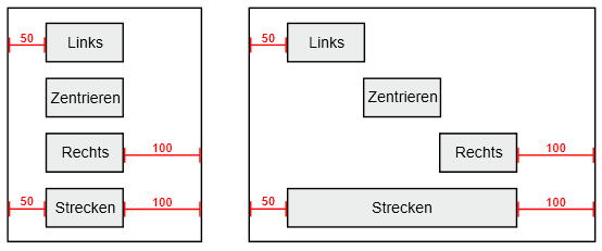 Das folgende Beispiel veranschaulicht die vier horizontalen Layout-Optionen: 'Links', 'Zentrieren', 'Rechts' und 'Strecken'. Die Grafik zeigt den Inhalt einer HMI-Symboldefinition in der Standardgröße (linkes Bild) und eine Instanz dieses Symbols mit geänderter Breite (rechtes Bild).