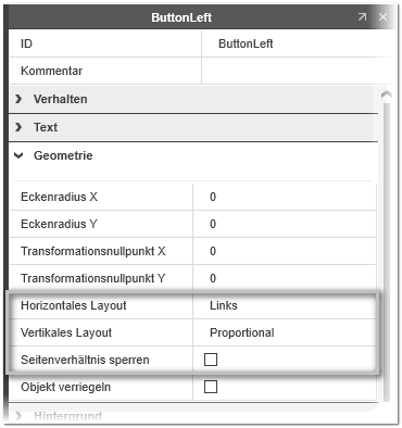 Wenn Sie für ein HMI-Symbol die Größenänderungsmethode 'Layout-Eigenschaften verwenden' einstellen, enthält das Eigenschaftenfenster für eine beliebige Auswahl von HMI-Objekten innerhalb des Symbols neue Layout-Eigenschaften in der Kategorie 'Geometrie', wie im folgenden Beispiel gezeigt. (Eine Beschreibung der Eigenschaften und Beispiele für ihre Verwendung finden Sie in den folgenden Abschnitten).