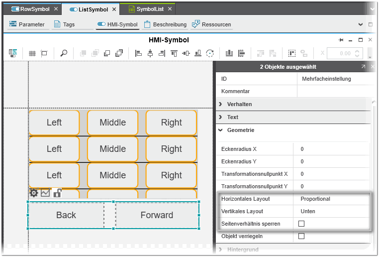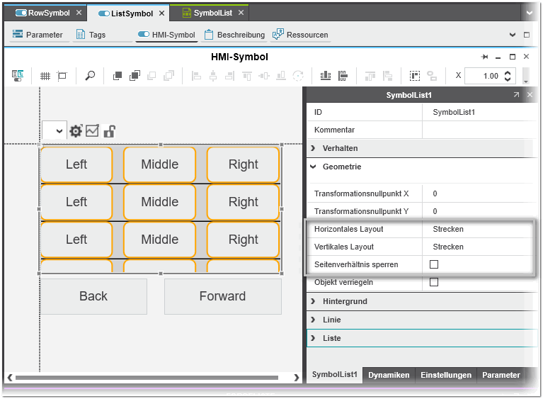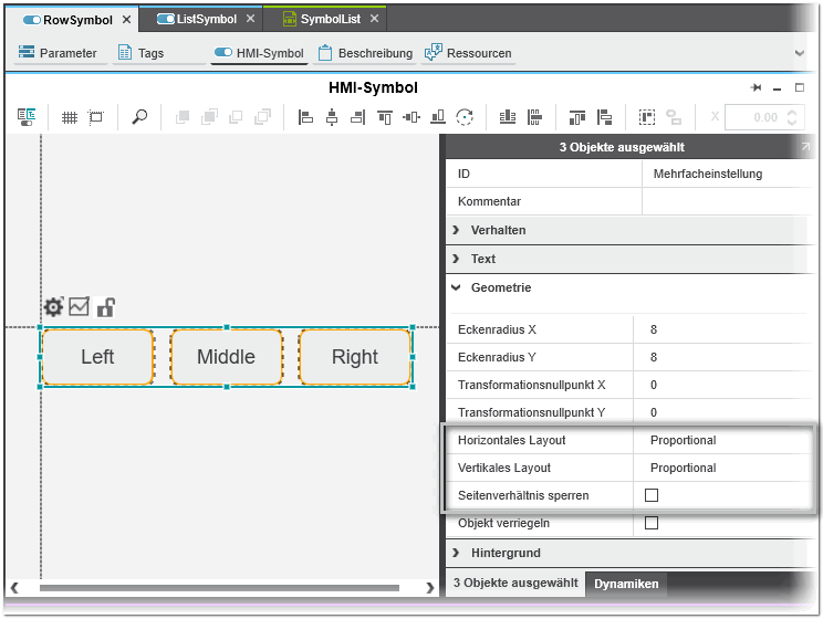 In diesem Beispiel wird das HMI-Symbol 'RowSymbol' in der Symbolliste instanziiert, die im HMI-Symbol 'ListSymbol' verwendet wird. Das HMI-Symbol 'RowSymbol' enthält drei Tastenflächen mit den folgenden 'Geometrie'-Eigenschaften: