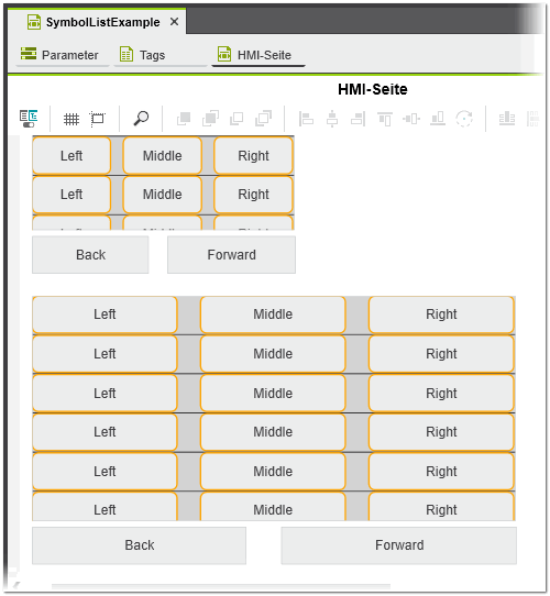 Wenn Sie eine Instanz des 'ListSymbol' auf einer HMI-Seite einfügen und die Instanz auf der Seite in der Breite vergrößern (wie in der folgenden Abbildung gezeigt), werden die Schaltflächen auf intelligente Weise in der Breite verändert, d. h. sie behalten ihre Höhe, Schriftgröße, Zeilenbreite usw. bei. Neue Tabellenzeilen werden in der Symbolinstanz hinzugefügt, wenn diese in der Höhe vergrößert wird. Der gesamte in der Symbolinstanz verfügbare Platz wird genutzt. (Die folgende Grafik zeigt den Inhalt der Symboldefinition in der Standardgröße (oberes Bild) und eine Instanz dieses Symbols mit geänderter Größe (unteres Bild).)