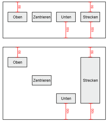 Das folgende Beispiel veranschaulicht die vier vertikalen Layout-Optionen: 'Oben', 'Zentrieren', 'Unten' und 'Strecken'. Die Grafik zeigt den Inhalt einer HMI-Symboldefinition in der Standardgröße (oberes Bild) und eine Instanz dieses Symbols mit geänderter Höhe (unteres Bild).