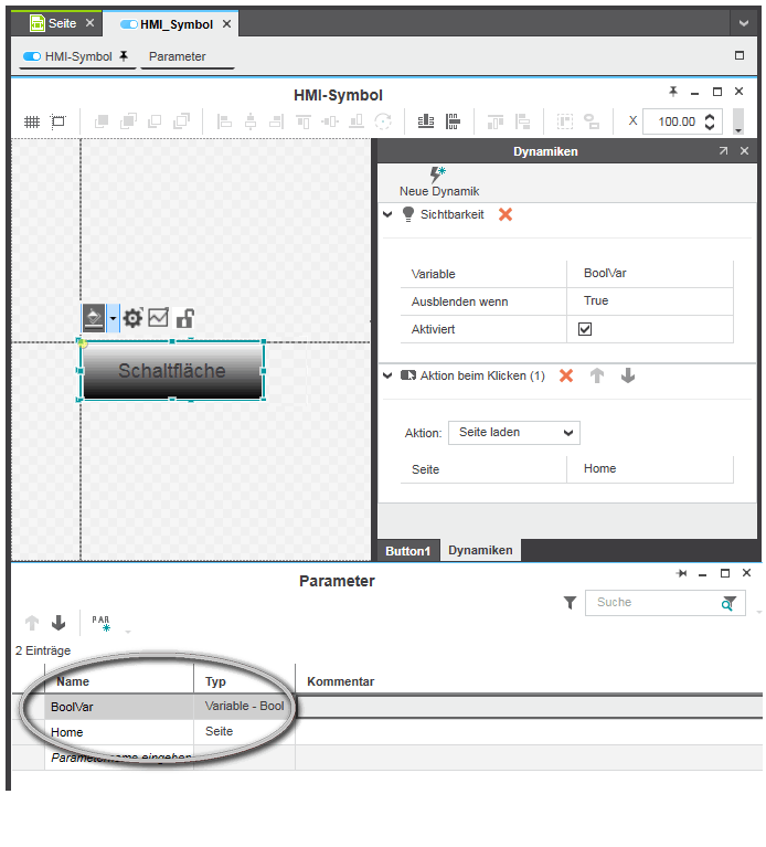 - Eine bestehende Verknüpfung mit einer HMI-Seite oder einem HMI-Tag wird automatisch in einen Symbolparameter umgewandelt (erscheint als Symbolparameter im 'Parameter'-Editor des Symbols). Die Namen der Symbolparameter werden automatisch aus den ursprünglich verknüpften Elementen übernommen (siehe folgendes Beispiel).