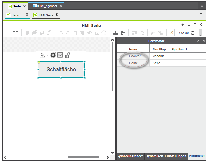 Die Symbolparameter des HMI-Symbols werden im 'Parameter'-Editor bearbeitet. Sie öffnen/schließen den Editor über die entsprechende Registerkarte im Editorenbereich.