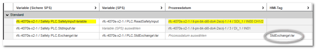 - HMI-Tags können für Austauschvariablen erzeugt werden, d. h. für Variablen mit Standard-Datentyp der sicherheitsbezogenen SPS, die einer globalen Variablen der Standard-Steuerung zugeordnet sind.