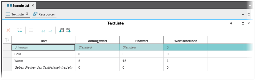 - Öffnen Sie den Editor 'Textliste'.Jeder Eintrag in der Textliste besteht aus der Zeichenfolge, einem Start- und Endwert sowie einem zu schreibenden Wert. Die Start- und Endwerte definieren den Wertebereich, der zur Laufzeit als Auswahlkriterium für den Textlisteneintrag dient. Das bedeutet, wenn der Wert der Variablen (HMI-Tag), die mit der Textlistendynamik verknüpft ist, innerhalb des angegebenen Wertebereichs liegt, wird der zugehörige Text in der Visualisierung angezeigt. Der Schreibwert gibt den Wert an, der zur Laufzeit in die mit der Textlistendynamik verknüpften Variable (HMI-Tag) geschrieben wird, wenn der Text vom Anwender ausgewählt wird.Um zu verhindern, dass in der Visualisierung ein leeres Element angezeigt wird, wenn der Wert der Variablen nicht in einem der definierten Wertebereiche liegt, können Sie in der ersten (grau hinterlegten) Zeile der Tabelle einen Standardtext eingeben (Start- und Endwert für den Standardtext sind gesperrt). Um zur Laufzeit einen bestimmten Wert in die verknüpfte Variable zu schreiben, wenn der Variablenwert nicht in einem der definierten Wertebereiche liegt oder wenn der Standardtext vom Anwender ausgewählt wird, können Sie in der Spalte 'Wert schreiben' einen Wert eingeben.