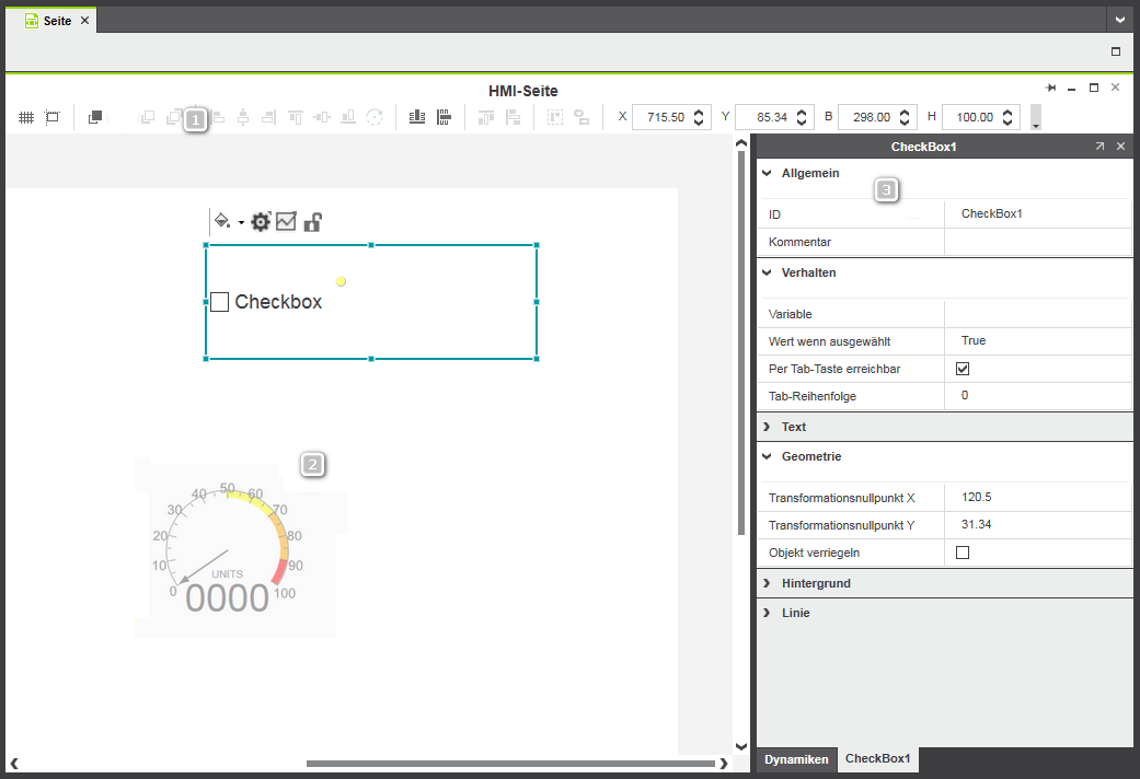 | (3) | EigenschaftenfensterIm Eigenschaftenfenster werden sowohl objektspezifische Eigenschaften als auch Eigenschaften der HMI-Seite und Parameter der HMI-Symbole eingestellt. In dem Fenster können Sie die statischen Eigenschaften eines Objekts festlegen, ein Objekt mit Dynamiken verknüpfen, usw. Je nach Objekt, das auf der HMI-Seite ausgewählt ist, enthält das Eigenschaftenfenster unterschiedliche Registerkarten. Welche Registerkarten tatsächlich verfügbar sind, hängt vom ausgewählten Objekt ab.Über das 'Abdocken'-Symbol in der Titelleiste kann das Fenster von der Benutzeroberfläche abgedockt und an einer beliebigen Stelle auf dem Bildschirm abgelegt werden. Um es wieder an der ursprünglichen Position einzufügen, klicken Sie auf das 'Andocken'-Symbol .Sie können das Eigenschaftenfenster einblenden oder ausblenden, indem Sie im Zeichenbereich rechtsklicken und 'Einstellungen einblenden/ausblenden' aus dem Kontextmenü wählen, oder indem Sie an einer beliebigen Stelle auf der Seite doppelklicken. |