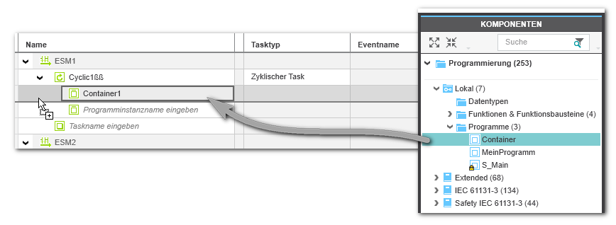 Ziehen Sie die Programm-POE aus den KOMPONENTEN auf eine leere Tabellenzeile unterhalb des gewünschten Task. Die neue Programminstanz wird mit einem vorgeschlagenen Namen in die Tabelle eingefügt.