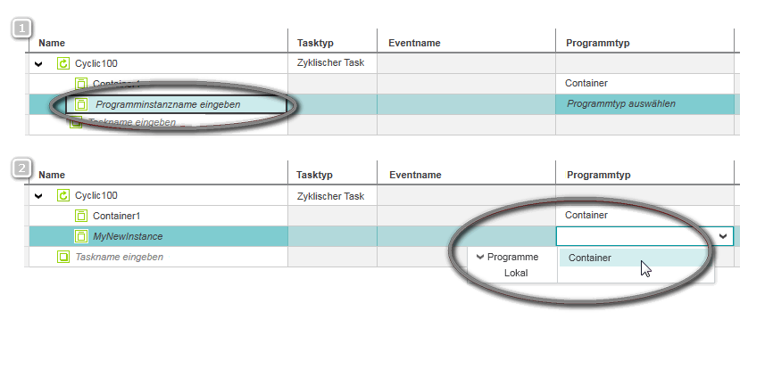 2. Finden Sie im 'Tasks und Events'-Editor den Task, dem Sie eine Programminstanz zuweisen möchten (Task Cyclic100 im Beispiel (1)). Programminstanzen, die dem Task bereits zugewiesen sind, sind als untergeordnete Elemente aufgelistet.