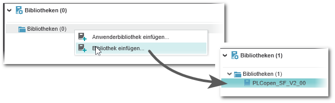 - Wenn im Quellprojekt PLCopen-FBs verwendet werden, müssen Sie die Bibliothek "PLCopen_SF_V2_00.pcwlx" einbinden. PLCopen V1.0 FBs werden beim Import automatisch in PLCopen V2.0 FBs konvertiert.