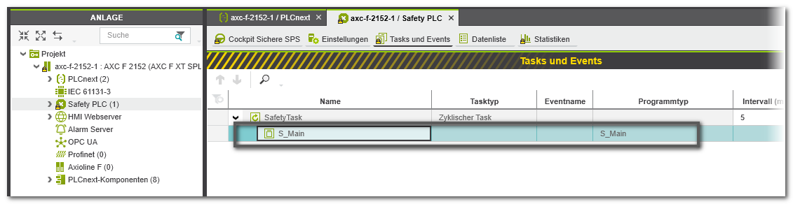 Benennen Sie gegebenenfalls vorher die bestehende POE S_Main um oder löschen Sie sie. Stellen Sie sicher, dass durch das Löschen des "alten" Main-Programms kein bereits entwickelter sicherheitsbezogener Code gelöscht wird. Sie können zum Beispiel vorhandenen Code mit der importierten Programm-POE zusammenführen. - Stellen Sie sicher, dass die Programm-POE S_Main im 'Task und Events'-Editor des 'Safety PLC'-Knotens instanziiert ist.
