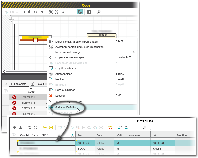 - Rechtsklicken Sie im Code-Arbeitsblatt auf die betroffene Variable und wählen Sie 'Gehe zu Definition' aus dem Kontextmenü. Es wird die 'Datenliste' der Sicherheitssteuerung geöffnet und dort die globale Deklaration der Variablen markiert.Beispiel für SSEM0016: