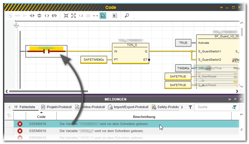 - Klicken Sie im MELDUNGEN-Fenster auf die Meldung, um in die Datenliste der Sicherheitssteuerung zu springen. Die betroffene Variable ist dort markiert.