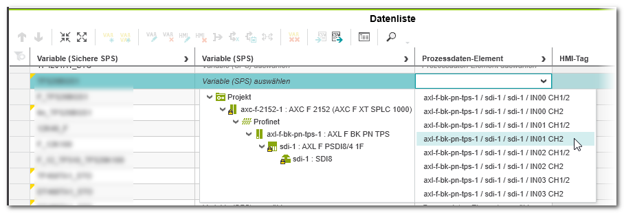 WARNUNGUnbeabsichtigter Betriebszustand des Geräts - Validieren Sie die Zuordnungen zwischen Variablen und Prozessdaten-Elementen (Signalen) und prüfen Sie die Applikation sorgfältig.