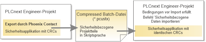 Der Zweck dieses Verfahrens besteht darin, den sicherheitsbezogenen Teil eines Projekts extern bearbeiten und wieder importieren zu können, ohne die Projekt-CRC zu verändern. Das PLCnext Engineer-Projekt wird so um die extern erstellte Sicherheitsapplikation ergänzt und bleibt dabei gültig und kompilierbar.