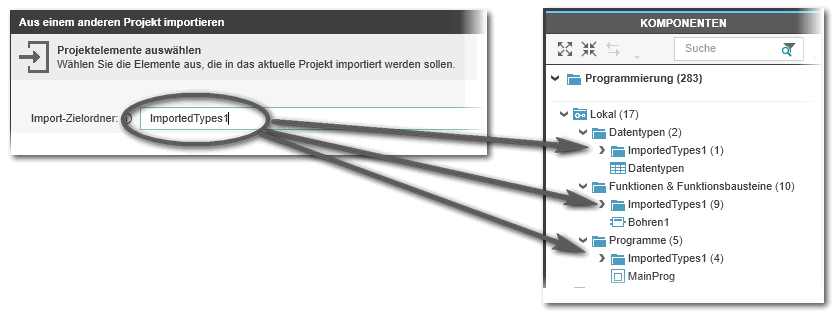Der Befehl 'Aus einem anderen Projekt importieren' übernimmt Typen aus einem anderen PLCnext Engineer-Projekt in ein vorhandenes Projekt. Beim Import spielt es keine Rolle