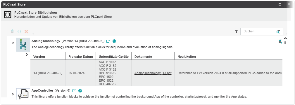 Herunterladen und Aktualisieren von Bibliotheken aus dem PLCnext Store