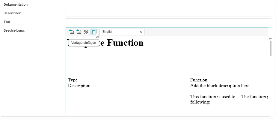 2. Klicken Sie im Bereich 'Dokumentation' in der Symbolleiste auf das Symbol ('Vorlage einfügen'). Abhängig davon, welchen POE-Typ Sie gerade bearbeiten, wird der Inhalt der Vorlagendatei (TemplateFunction.htm oder TemplateFunctionBlock.htm) aus dem Hilfevorlagenordner (siehe oben) in den Beschreibungsbereich eingefügt.