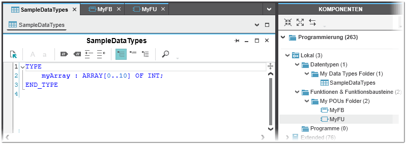 - Kategorien (Ordner), unter denen die Funktion/Funktionsbaustein-POEs und Datentyp-Arbeitsblätter in den KOMPONENTEN erscheinen.
